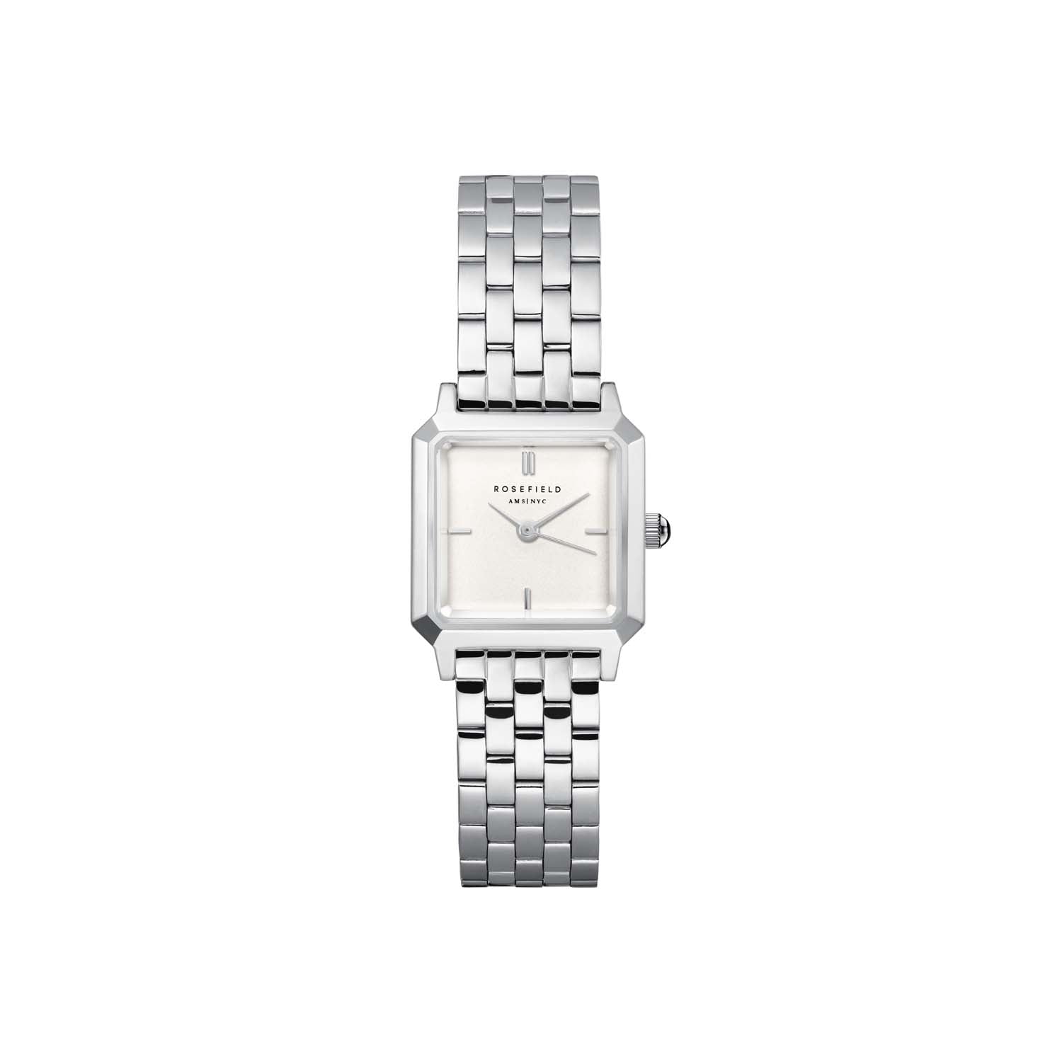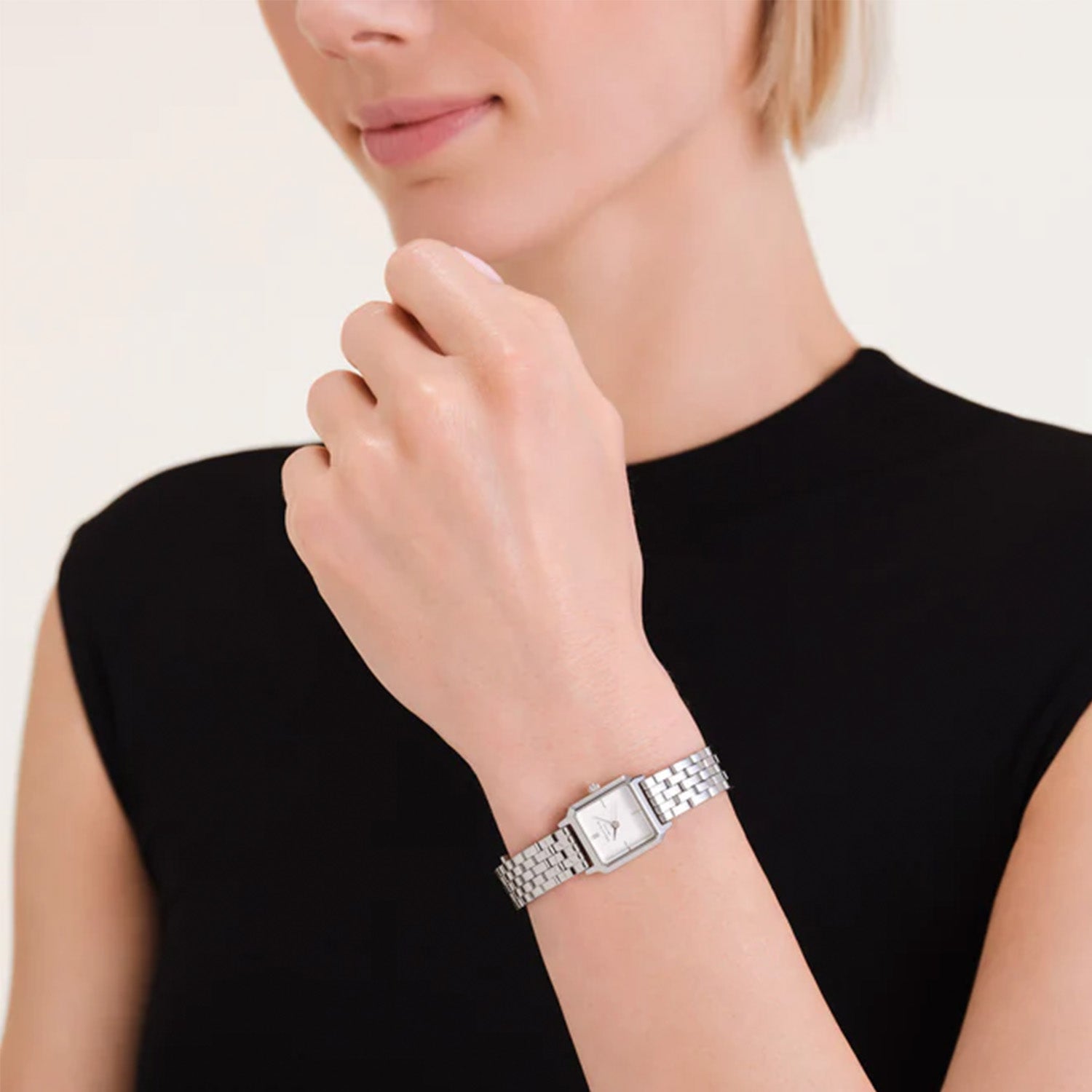 Uret har en skinnende hvid urskive, der står i smuk kontrast til det polerede rustfri stål. Den firkantede form på 19,5x19,5 mm tilføjer en moderne kant til det klassiske design. Armbåndet er elegant og komfortabelt, hvilket gør det behageligt at bære hele dagen.