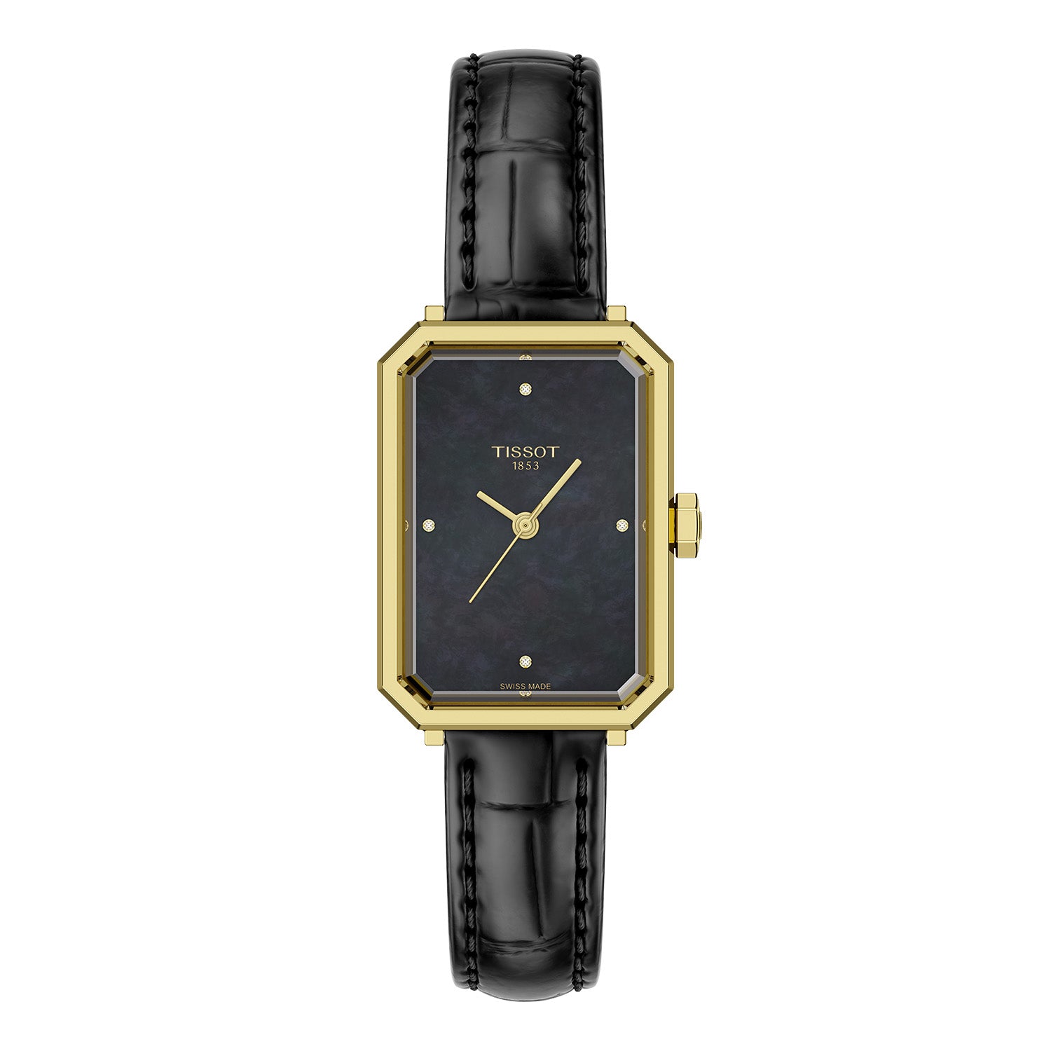 Urets rektangulære form på 30x22 mm giver det et unikt og moderne udtryk. Den sorte urskive fremhæves af de guldfarvede visere og markeringer, hvilket giver en elegant og letlæselig overflade. De indlagte diamanter tilføjer et strejf af luksus, der gør uret til et iøjnefaldende smykke.