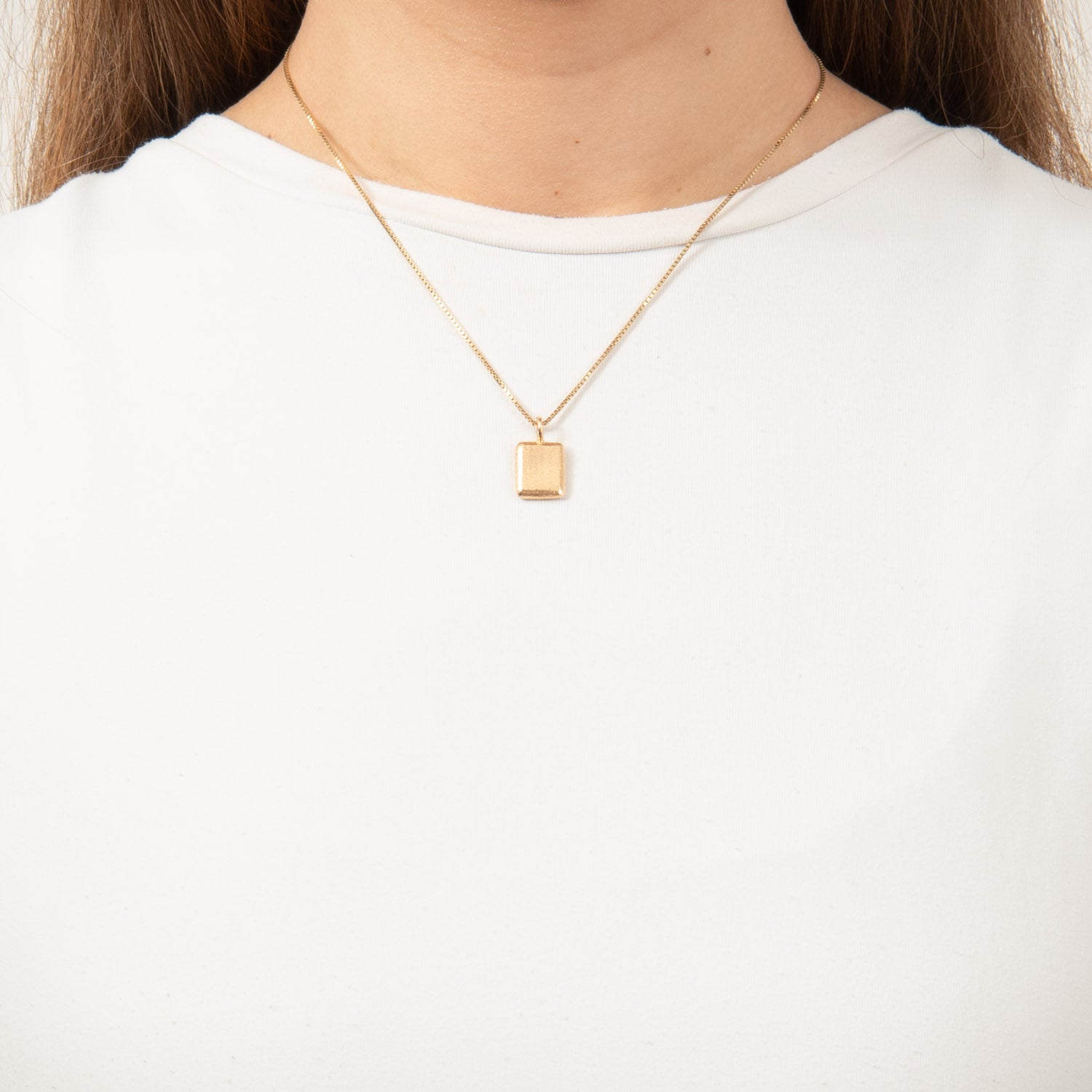 Leder du efter et elegant og personligt vedhæng, som både kan bæres alene eller kombineres med dine andre favoritter? Dette lille, håndlavede vedhæng i 14 kt. guld er et smukt og stilrent valg. Det firkantede pladedesign har en rå, fræset overflade, som giver et eksklusivt og moderne udtryk – perfekt til dig, der elsker det enkle med kant.