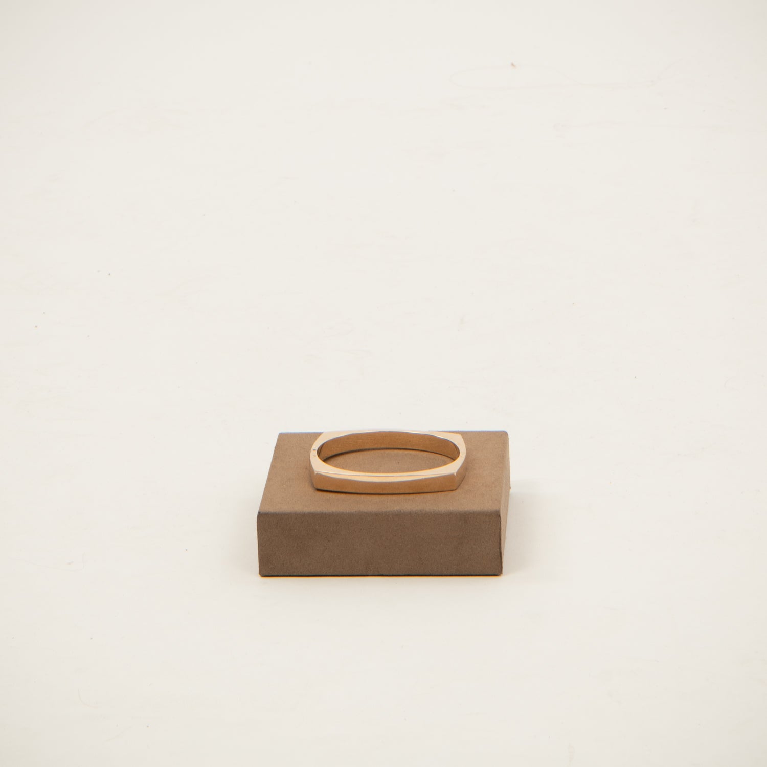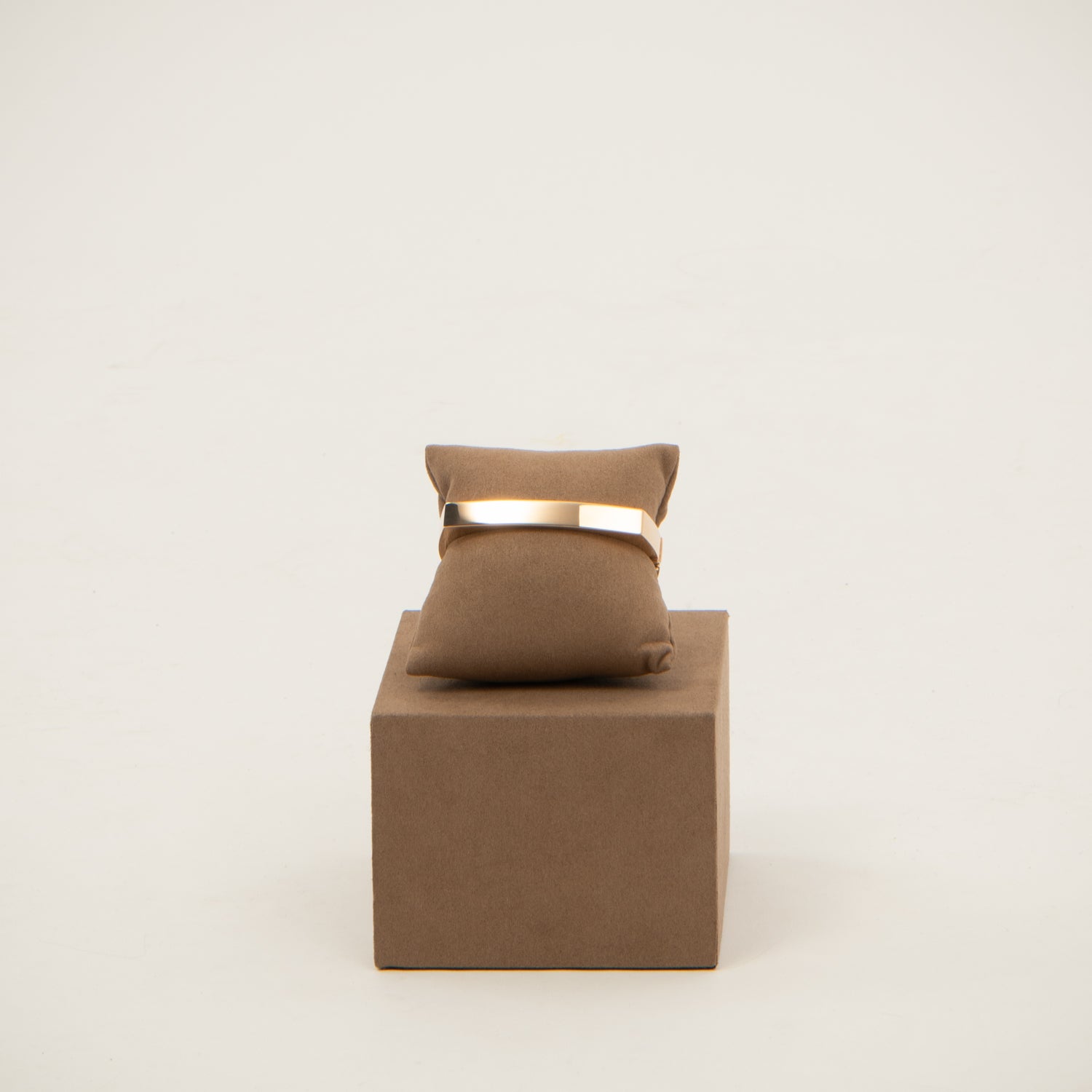 Elegant og stilren armring i 14 kt. rødguld, designet i en markant firkantet form med udvendige bløde hjørner og en indvendig diameter på ca. 60 mm. Det geometriske udtryk giver armringen en moderne kant, mens det varme guld og den blankpolerede overflade tilfører et klassisk og eksklusivt præg.