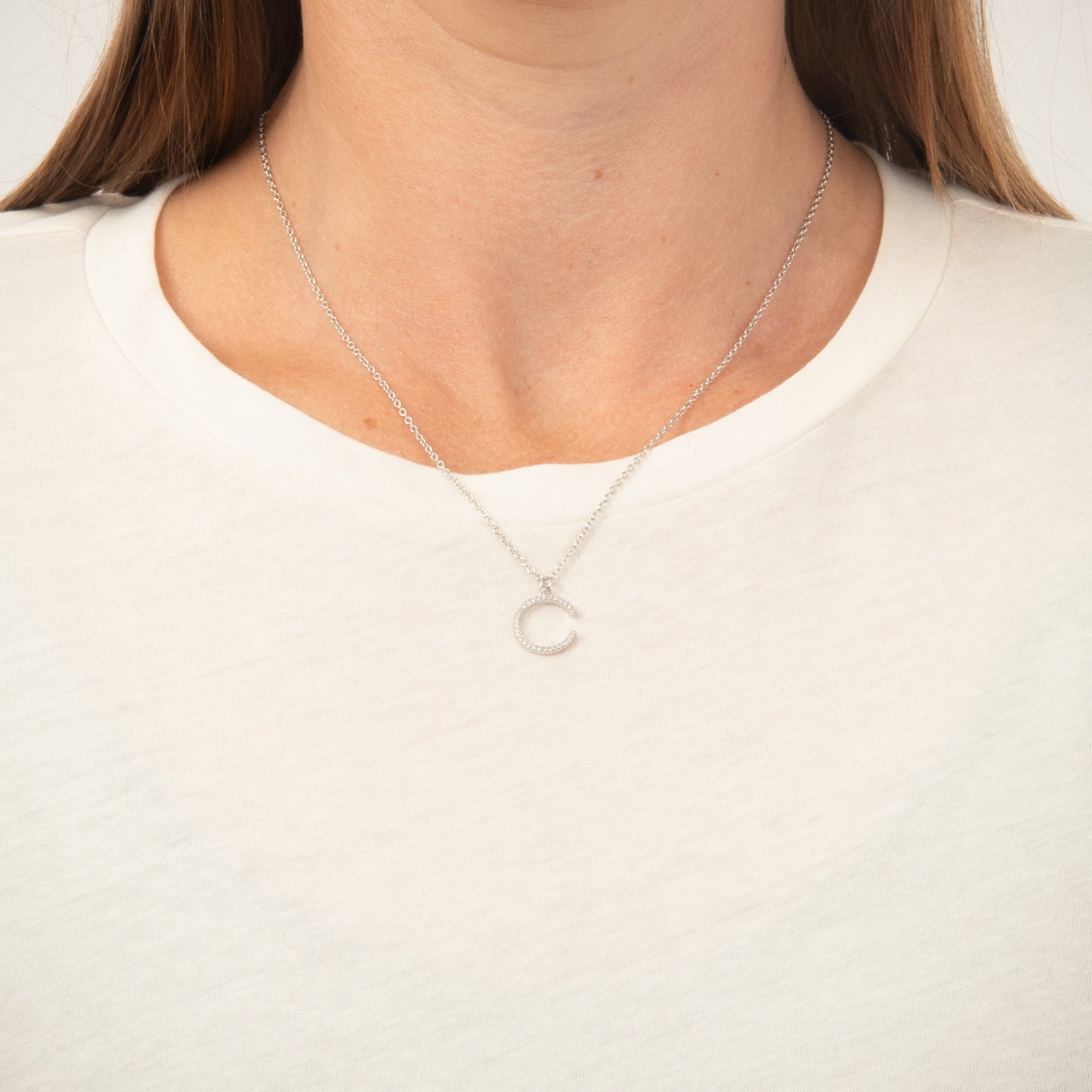 Halskæden er udført i rhodineret sølv, hvilket giver den en skinnende og sofistikeret finish. Det delikate design med det funklende bogstav "C" tilføjer en subtil elegance, der passer til enhver lejlighed. Kæden er let og behagelig at bære, hvilket gør den ideel til daglig brug.