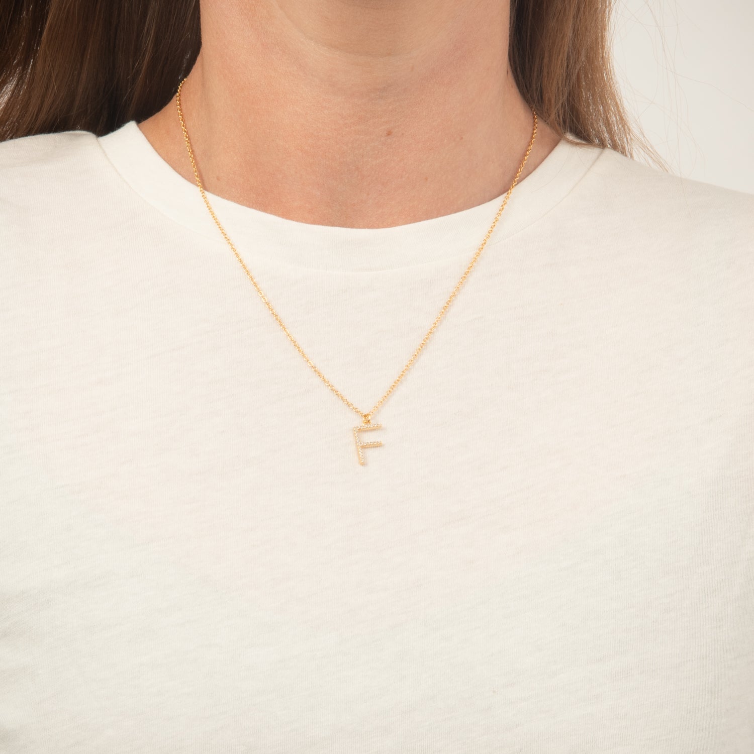 Halskæden har en smuk gylden nuance, der fanger lyset på en subtil og sofistikeret måde. Bogstavet "F" er udsmykket med små, funklende sten, der tilføjer en ekstra dimension af glamour. Kæden er delikat, men robust, hvilket gør den ideel til daglig brug eller særlige lejligheder.