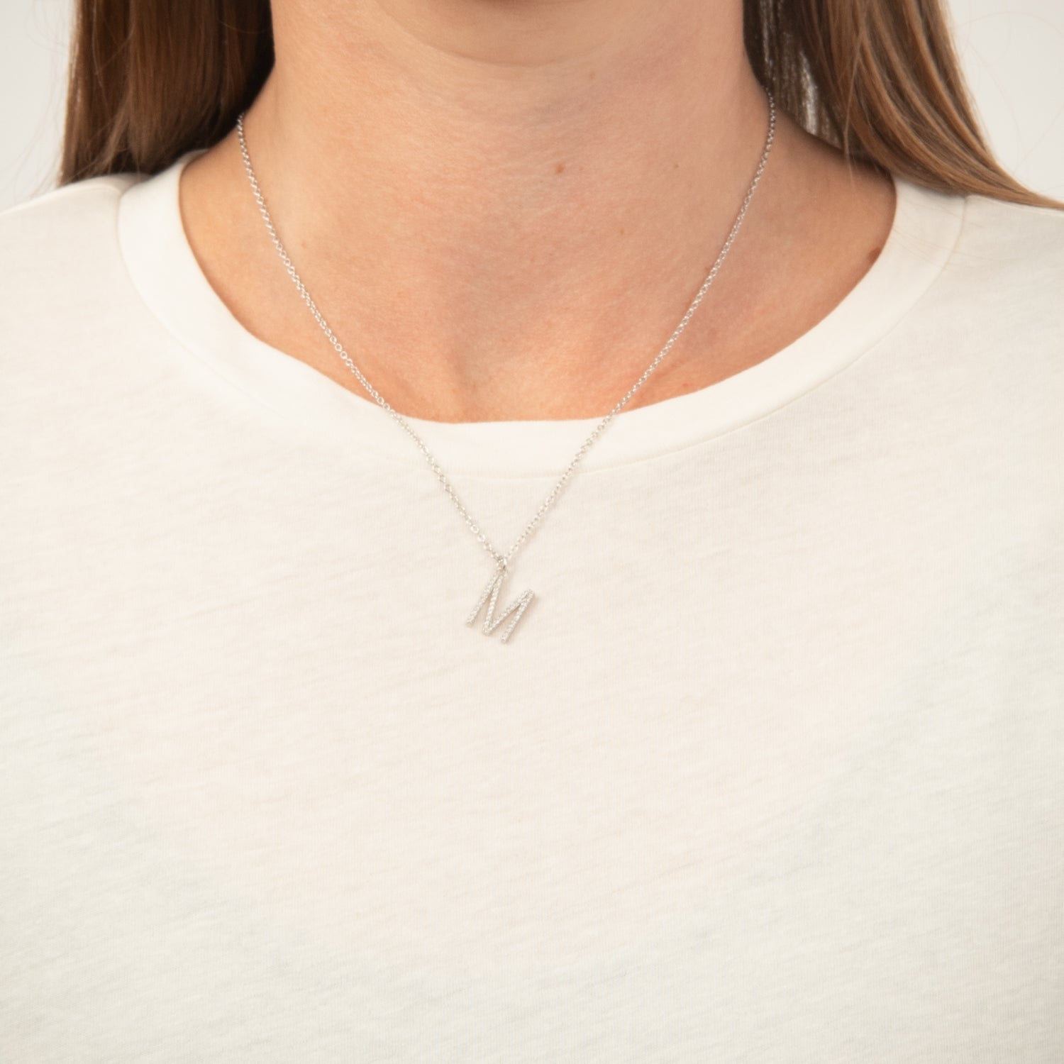 Designet af halskæden er både enkelt og sofistikeret. Det rhodinerede sølv giver en skinnende og luksuriøs finish, der fremhæver bogstavet 'M'. Kæden er fin og elegant, hvilket gør den ideel til både hverdag og særlige lejligheder. Bogstavet er dekoreret med små, funklende detaljer, der tilføjer et subtilt strejf af glamour.