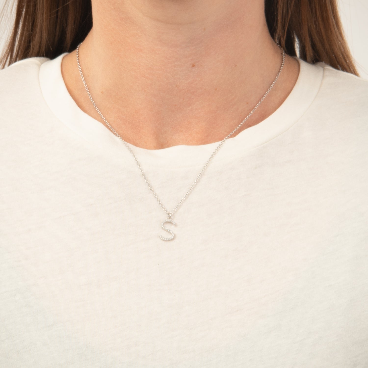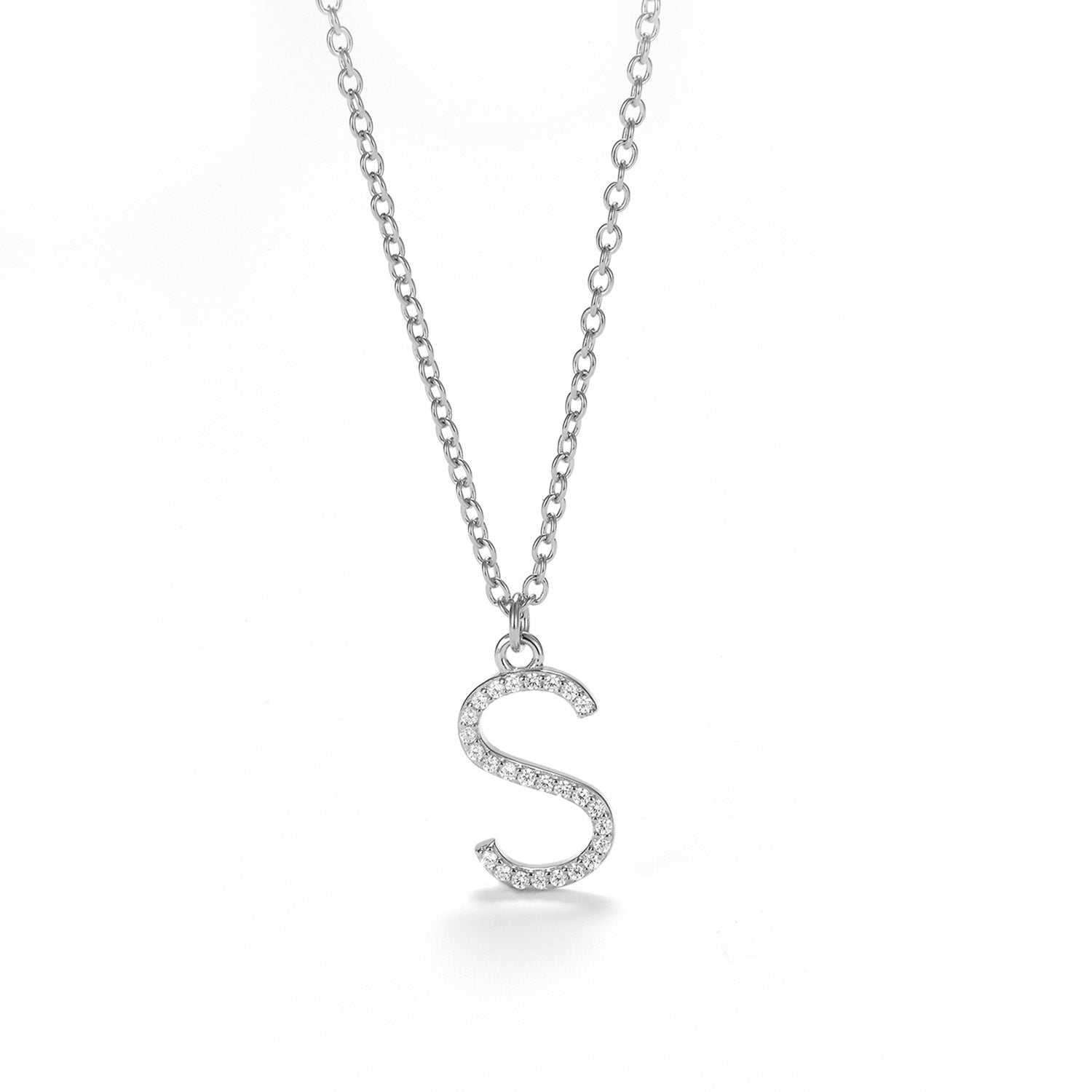 Halskæden er udført i rhodineret sølv, hvilket giver den en strålende og holdbar finish. Det delikate bogstav "S" er prydet med funklende detaljer, der fanger lyset smukt. Kæden er let og behagelig at bære, hvilket gør den ideel til daglig brug.